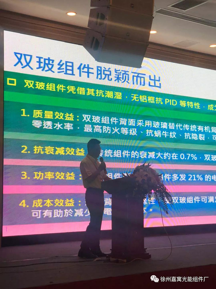 徐州嘉寓光能執行副總何植業在水面光伏電站雙玻組件技術的突破和應用方面和在座嘉賓進行了分享和探討。