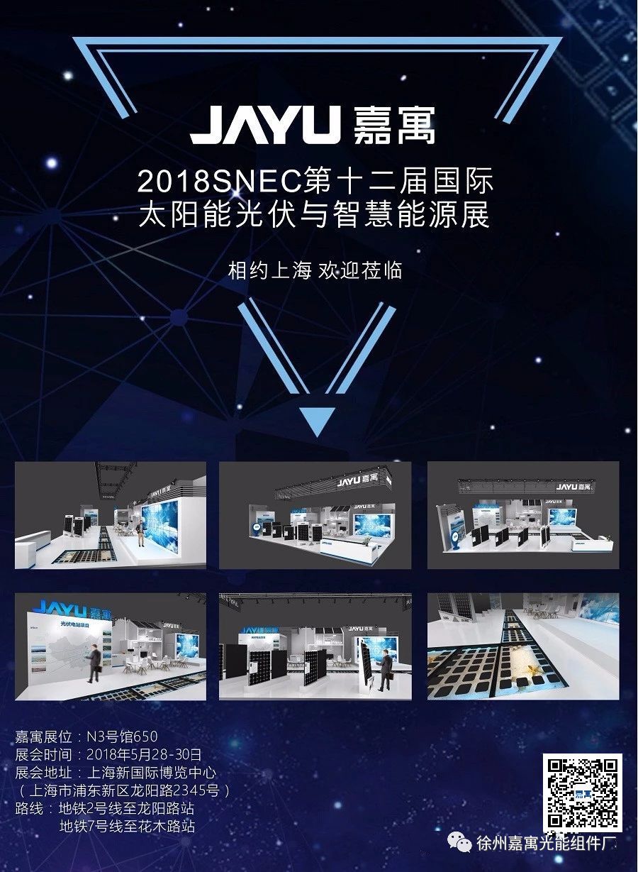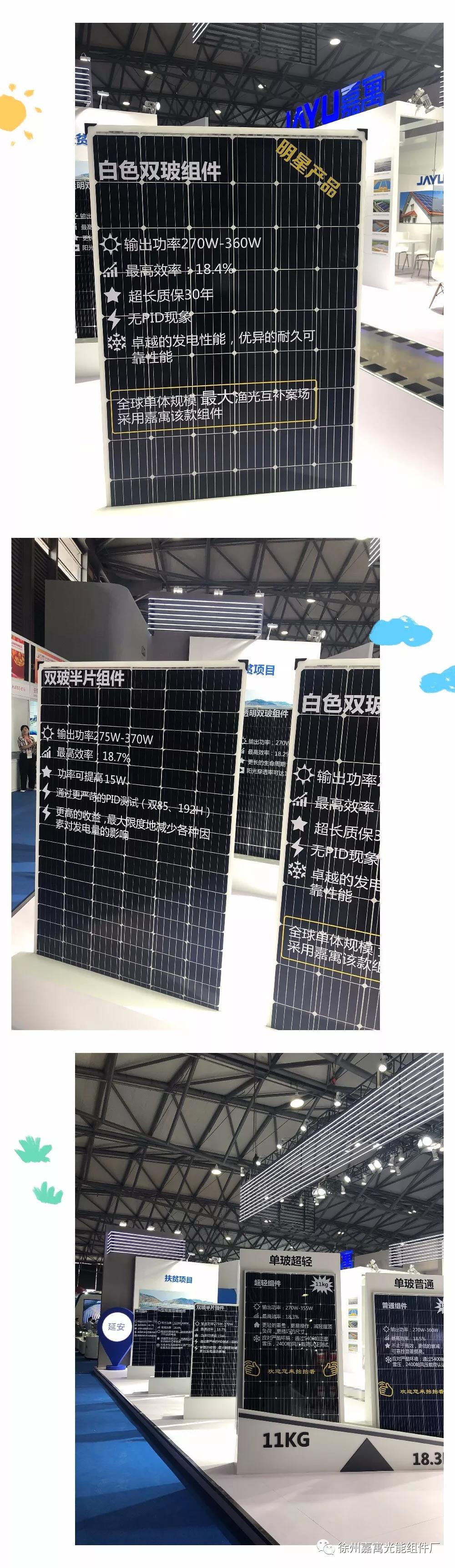 展品展示包括光伏組件、戶用光伏、光伏電站項目、扶貧項目展示區。今年嘉寓展臺一大亮點為白色雙玻組件產品,全球單體規模*大漁光互補案場采用嘉寓該款組件。該產品輸出功率270W-360W;*高效率18.4%;超長質保30年;無PID現象;具備*越的發電性能,優異的耐久可靠性能。