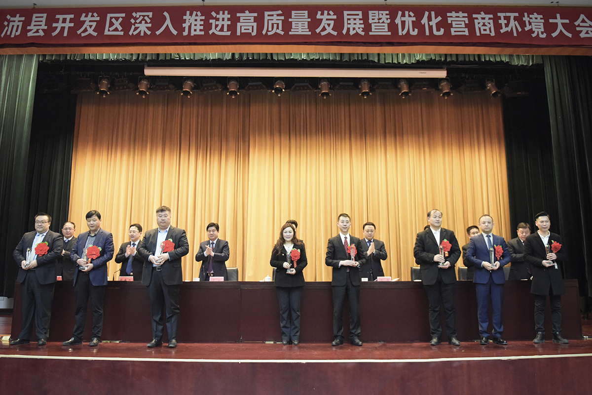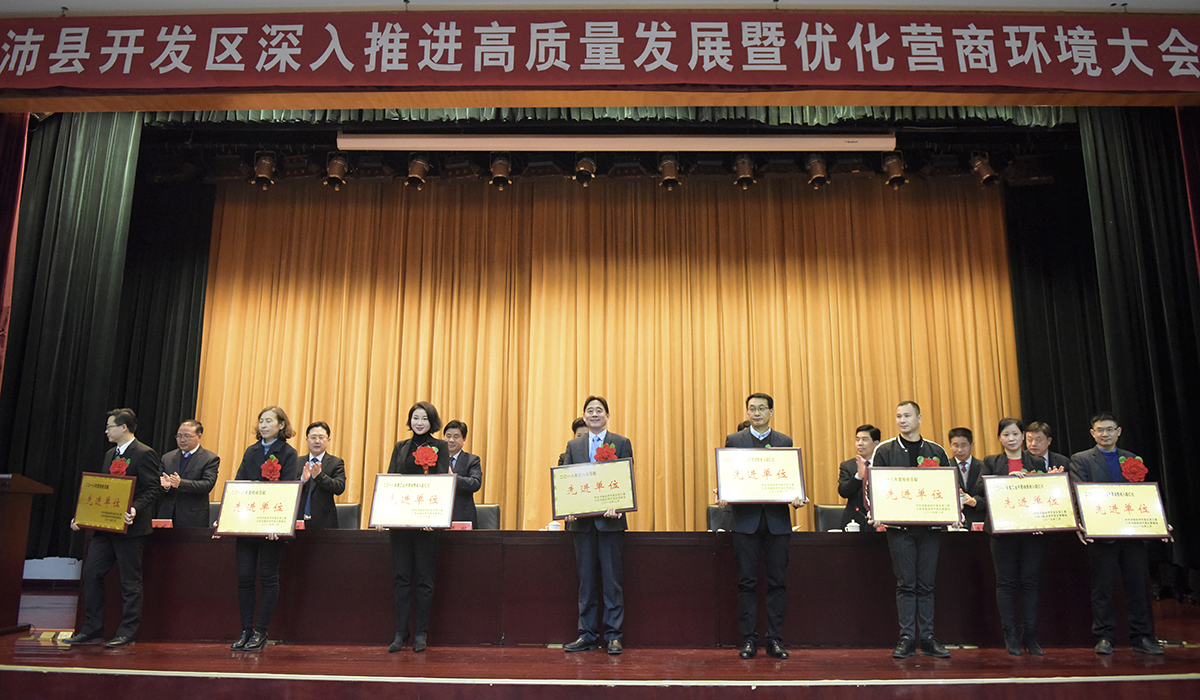 本次會議對2018年沛縣經濟開發區的各項工作進行了總結,對區內優秀企業、開發區先進單位和個人進行了表彰獎勵,嘉寓股份副總裁張國峰、徐州嘉寓光能總經理陳志榮分別代表公司上臺領獎。
