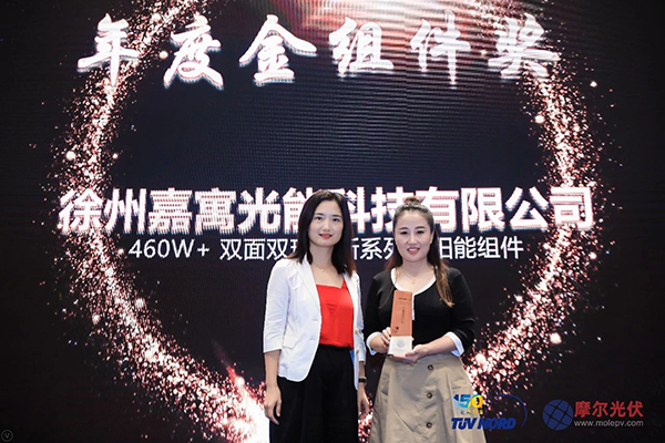 研討會議結束后,參會人士早就期待已久的“2019光伏風向獎頒獎典禮”在傍晚時分如約而至。本次頒獎典禮是由本屆雙面發電與平價上網技術路線研討會組委會組織,旨在鼓勵光伏企業在光伏行業技術進步中的創造性工作,促進光伏行業技術水平的提高,早日實現平價上網,獎勵高水平的光伏企業及人物取得的技術成果。繼在2018年的頒獎典禮獲得“卓效品質獎”之后,嘉寓光能在本屆2019光伏風向獎頒獎典禮上更進一步,一舉摘得“金組件”大獎。