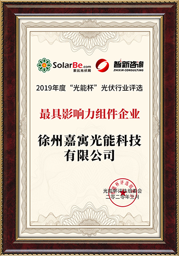 “光能杯”吸引了光伏行業眾多重量級企業的積極參與,以樹立行業標桿。徐州嘉寓光能科技有限公司獲此殊榮,是行業對嘉寓光能品牌建設、品質保證和致力于為客戶提供優質產品服務的高度認可,是對嘉寓光能良好的企業形象以及在光伏行業中不懈付出的肯定。